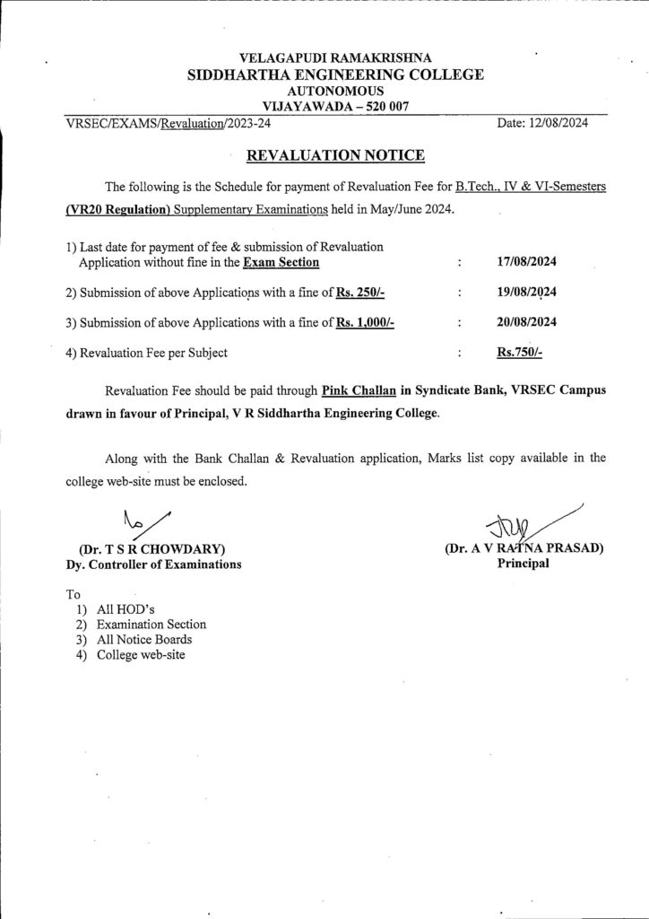 Revaluation notice for B.Tech., IV & VI-Semesters (VR20) Supplementary Exams, May/June-2024