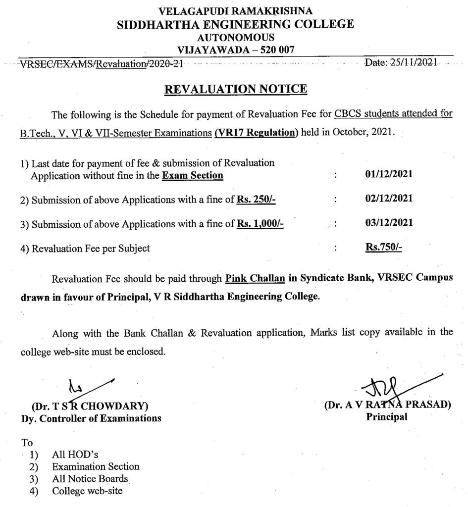 Revaluation notice for CBCS B.Tech Examinations held in Oct-2021